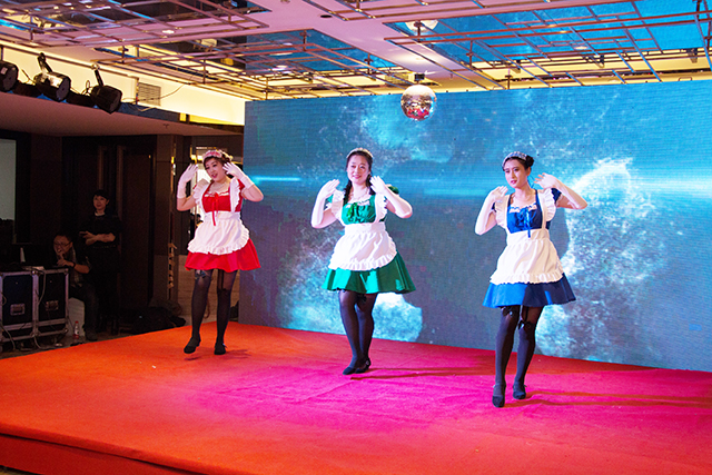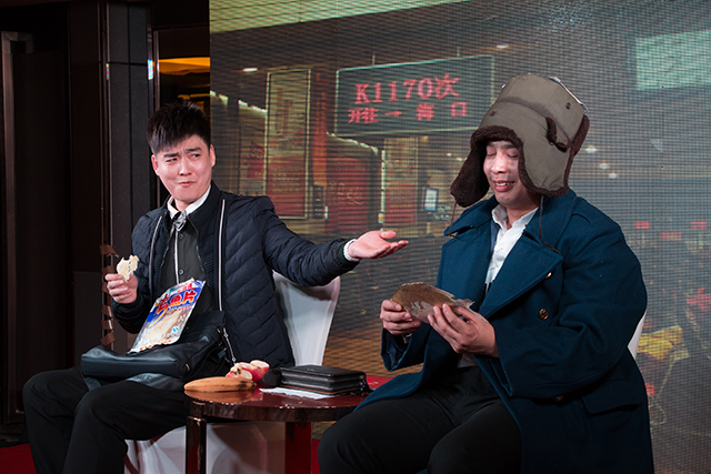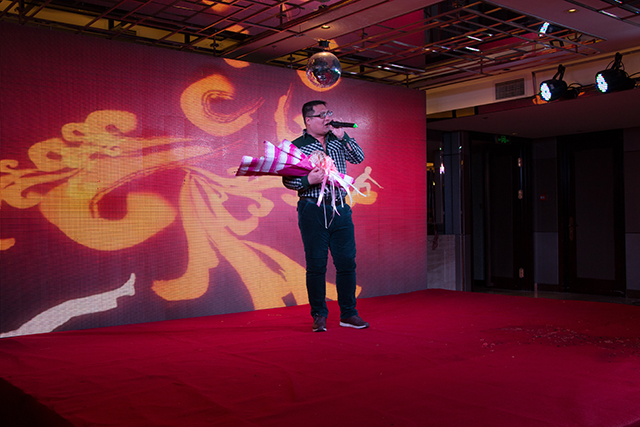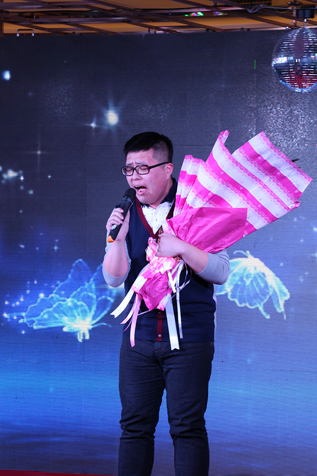 第二環節是生產制造部林秋楓的脫口秀《生活真煩惱》,搖身一變知心大姐和我們嘮嘮家長里短生活煩惱,最后一曲《社會搖》結束了“生活的煩惱”。不得不佩服林姐的好口才啊!今年晚會節目的“亮眼之作”小品《綁匪》,真是讓人眼前一片那啥啊(此處省略不說)。營銷部的賈殿鵬和市場部的王元峰為了節目也是蠻拼的啦。賈經理那一頭金色長發、和王經理那喜慶的肚兜兒,相信大家還是記憶猶新吧!集驚悚、懸疑、搞笑于一身的小品過后,在工程技術部夏寰宇的一首《你是我的眼》的歌聲中節目告一段落。之后游戲《看數字猜成語》、《背連背,心連心》火熱進行。同時由領導抽取幸運二等獎并頒發獎項。